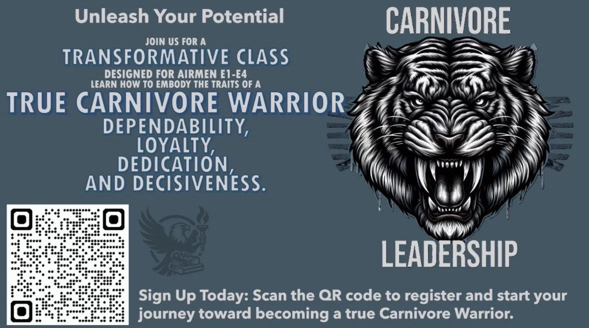 The Carnivore Leadership class focuses on building bold, decisive, and action-oriented leaders across the 4FW. This course dives into core leadership principles, Air Force standards, and real-world applications, equipping Airmen with the mindset and tools needed to lead with confidence and purpose. Whether you're a new Airman or a rising NCO, Carnivore Leadership is designed to challenge your perspective and sharpen your ability to lead from the front. If interested, RSVP using the link below.